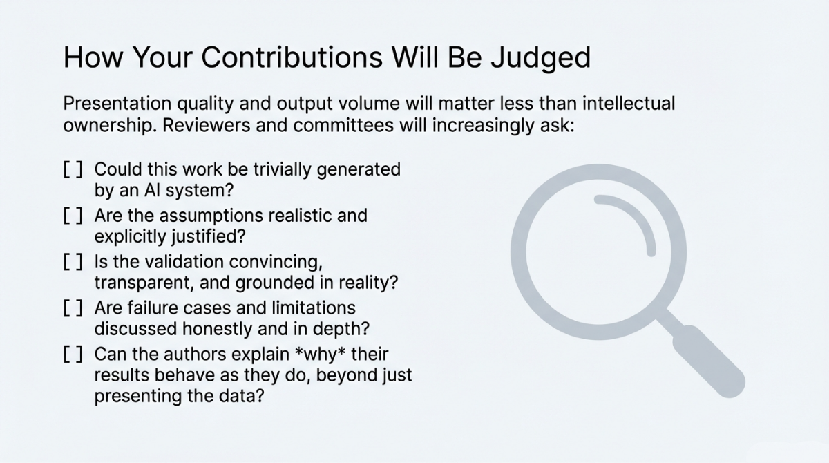 Consequently, the value of a Ph.D is no longer tied to how much one can produce, but to whether the researcher can demonstrate judgment, insight, validation, and responsibility for the ideas being presented.